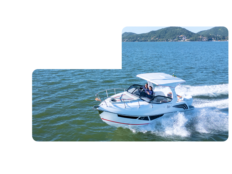 Lancha com motor de centro que combina desempenho e conforto. Mantém a praticidade de uma ampla plataforma de popa e oferece espaço interno inteligente, com comodidade para pernoites a bordo.